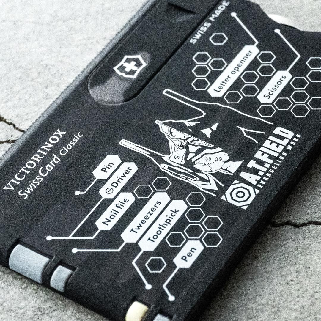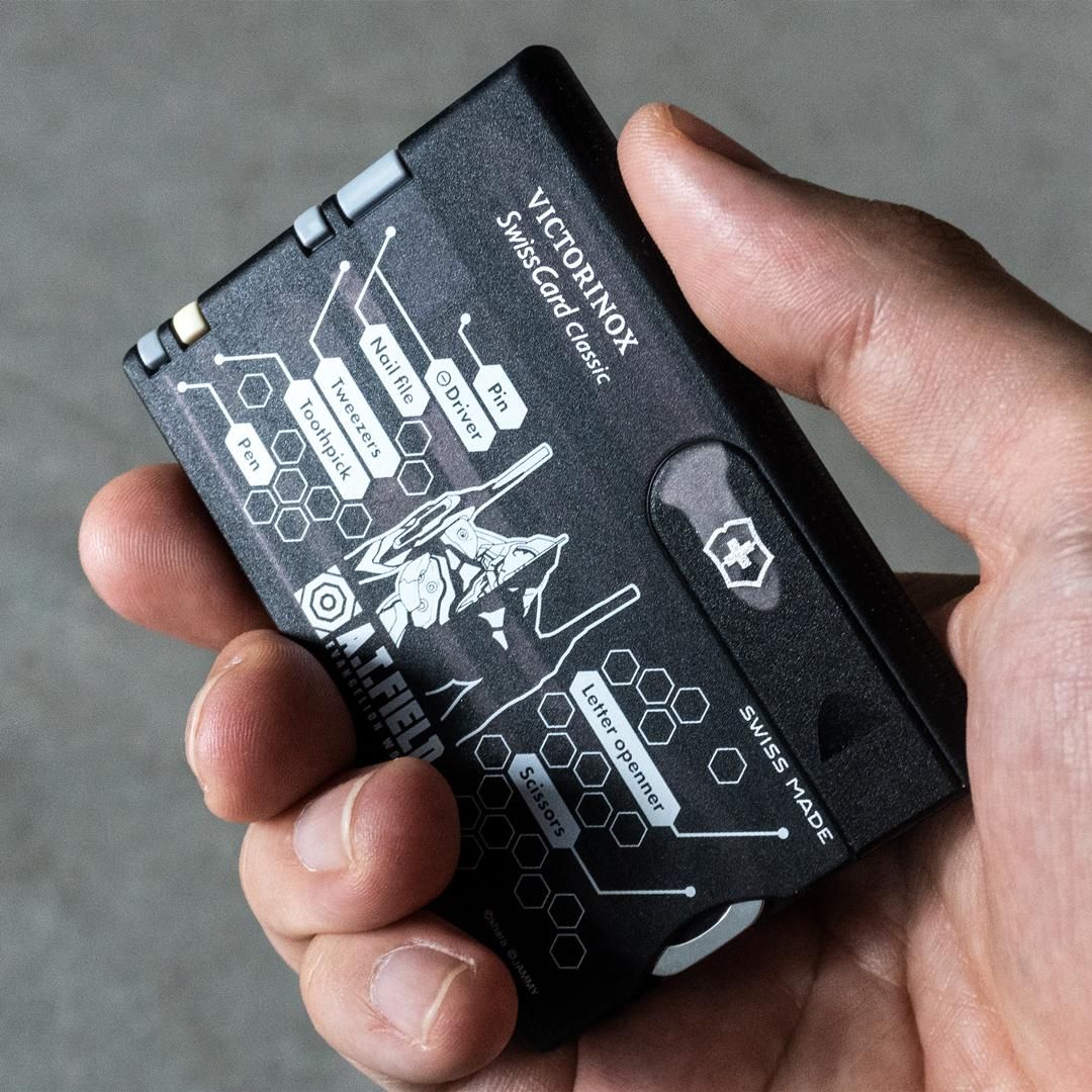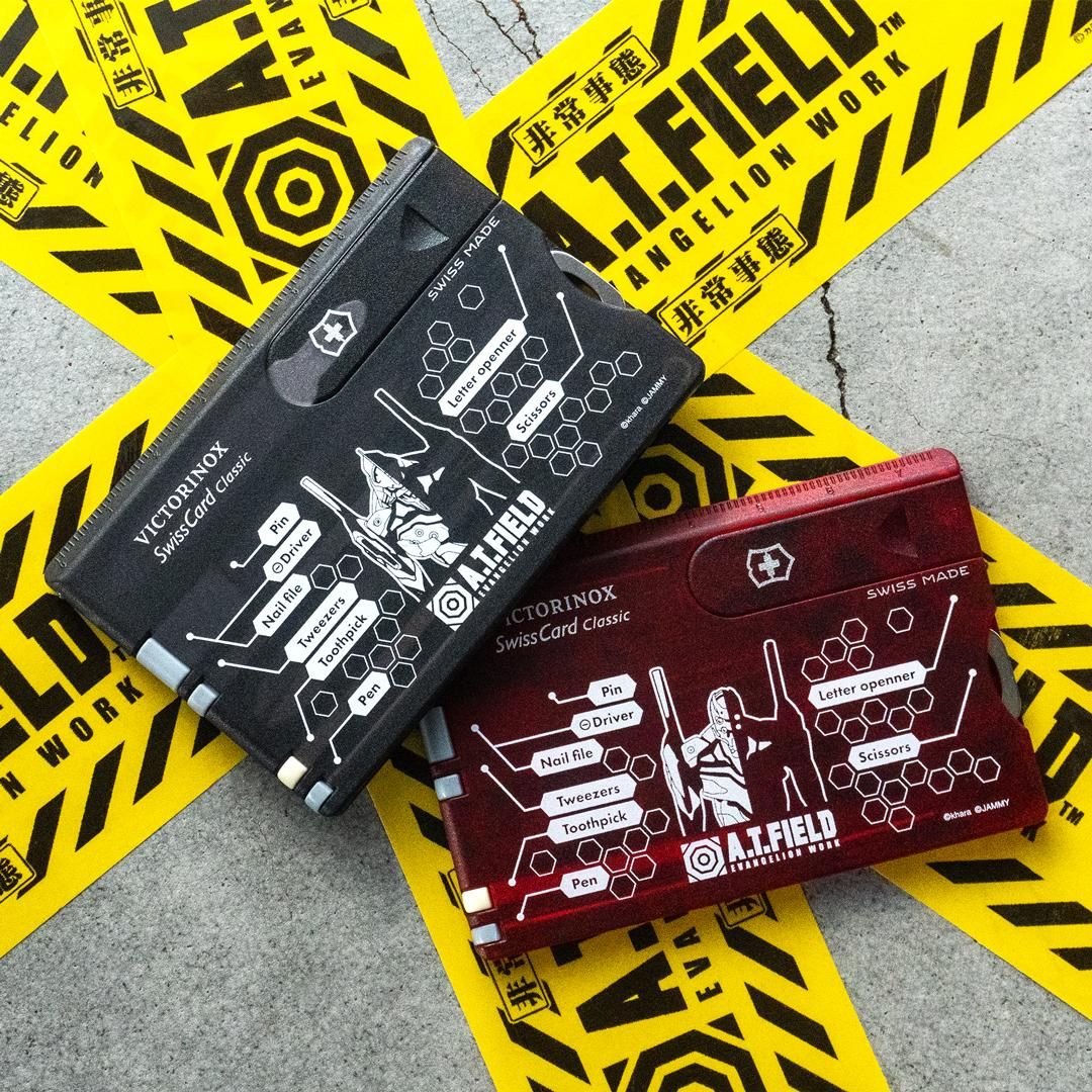 エヴァンゲリオンのワークブランド「A.T.FIELD EVANGELION WORK」と、1884年スイスでナイフメーカーとして創業しマルチツールをはじめとする高品質・高機能な商品を世界中で製造・販売し続ける「ビクトリノックス」の代表的な商品「スイスカード」がコラボレーションした、カード型マルチツールです。