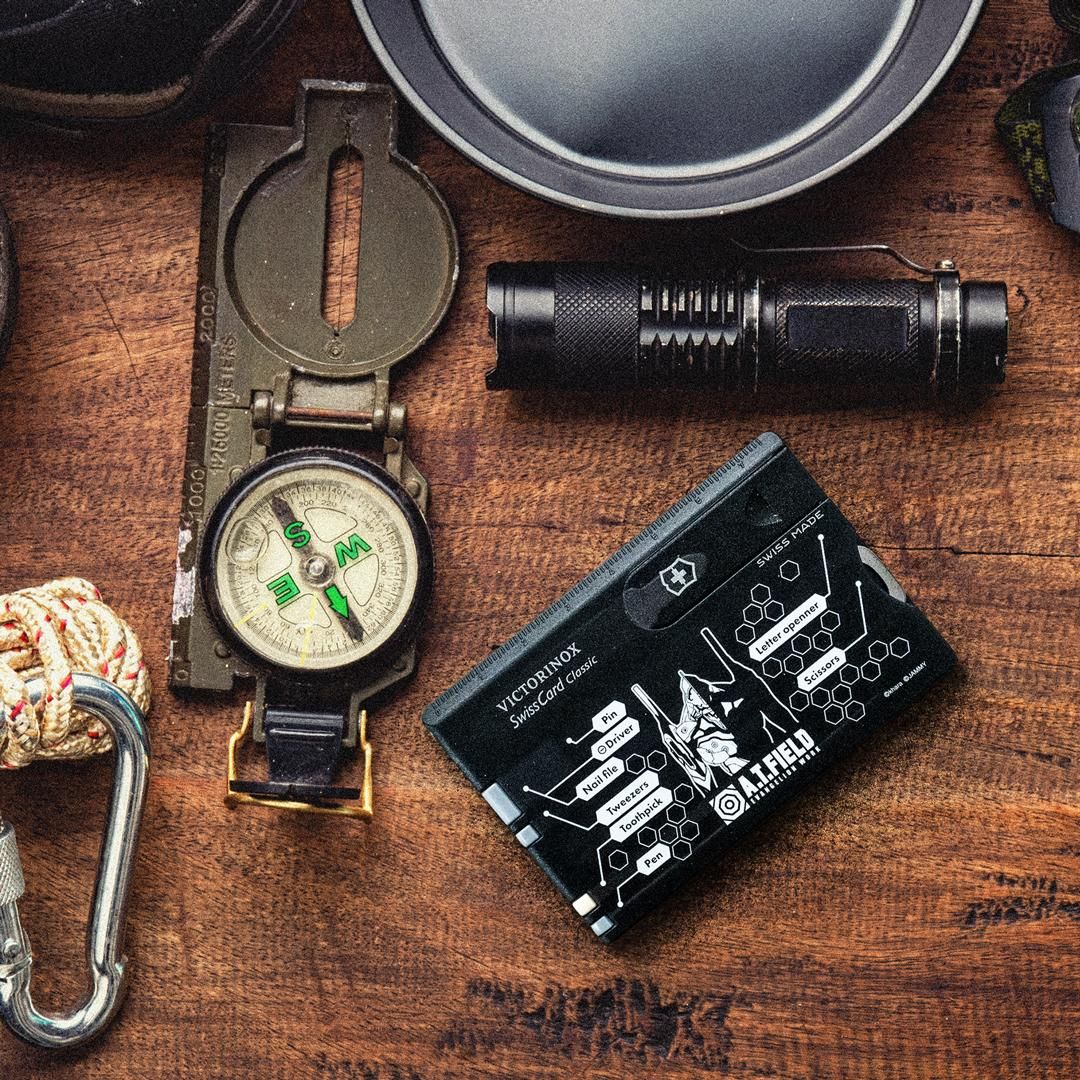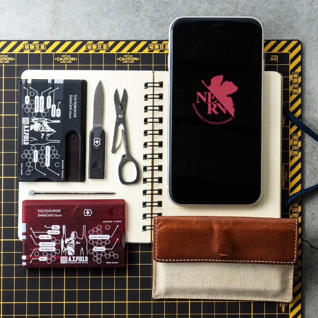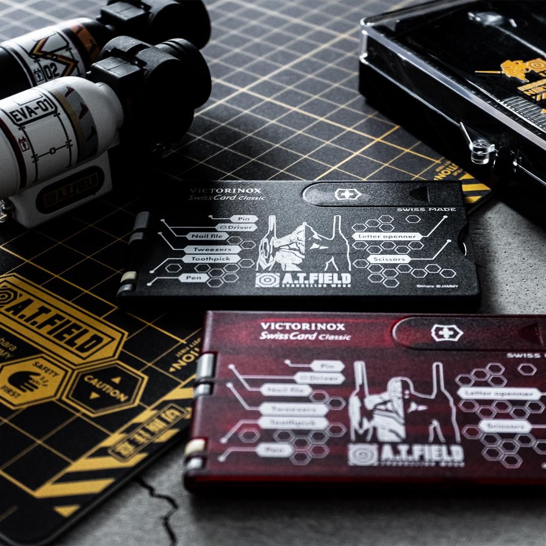 エヴァンゲリオンのワークブランド「A.T.FIELD EVANGELION WORK」と、1884年スイスでナイフメーカーとして創業しマルチツールをはじめとする高品質・高機能な商品を世界中で製造・販売し続ける「ビクトリノックス」の代表的な商品「スイスカード」がコラボレーションした、カード型マルチツールです。